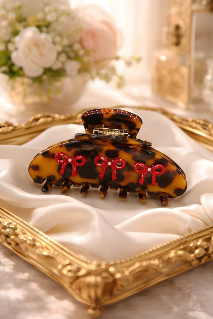 A chic leopard-print tortoiseshell hair claw clip accented with three glossy red bow details and a subtle touch of sparkle along the top. Bold yet feminine, it blends classic animal print with playful elegance—perfect for adding a stylish statement to both everyday looks and dressed-up moments. ❤️✨