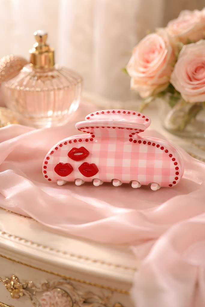 Channel confidence with this blush-toned gingham hair claw clip embellished with three red lip motifs and delicate rhinestone detailing. The soft pink checkerboard pattern offers a classic feminine touch, while the bold kiss accents add a flirty, empowering edge. Perfect for holding your hair securely while you take on the day with style and self-assurance.