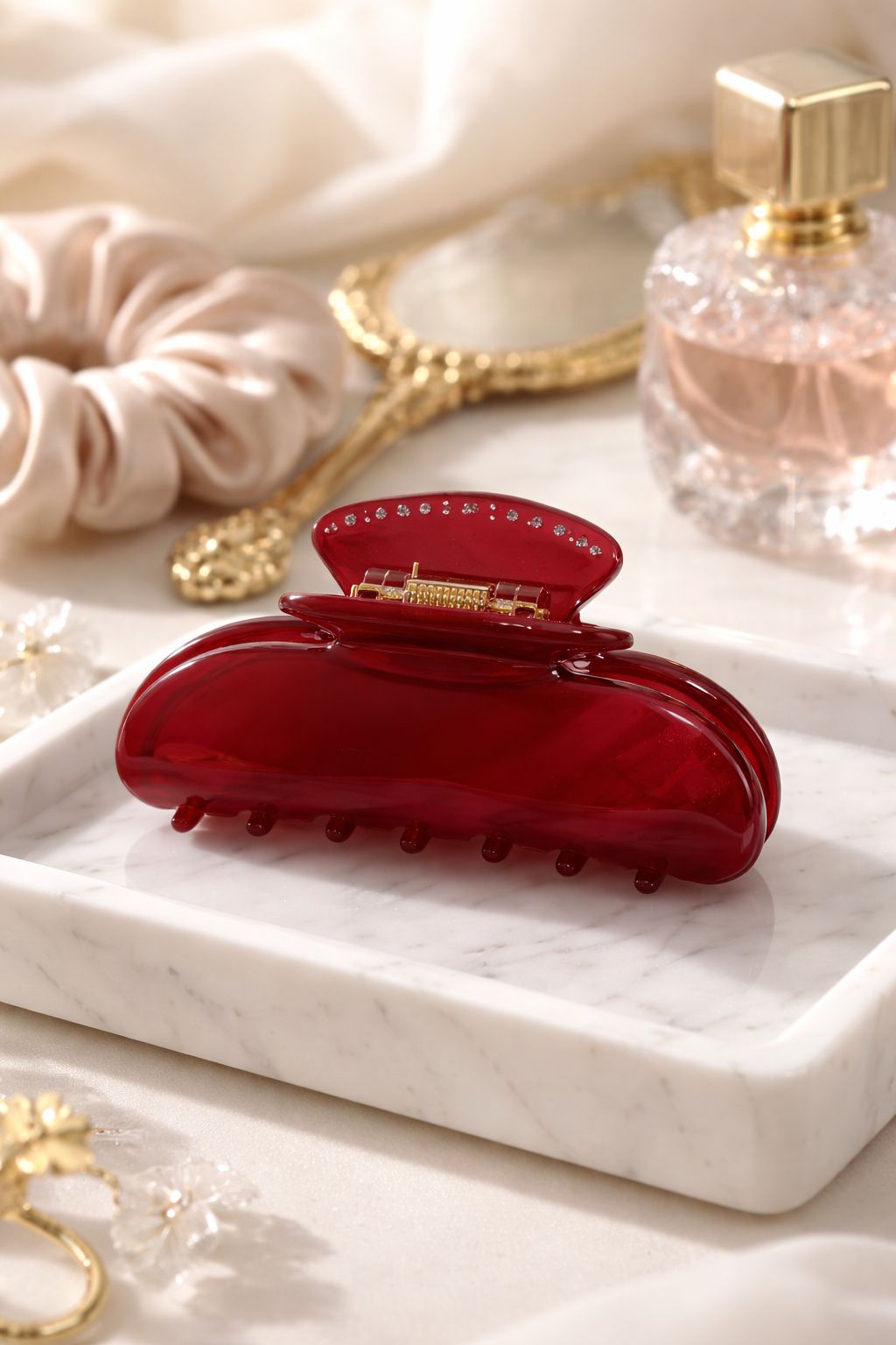 A glossy cherry-red claw clip finished with delicate crystal detailing and gold hardware. Designed for a secure hold with a polished, timeless feel - perfect for everyday glamour or special moments.