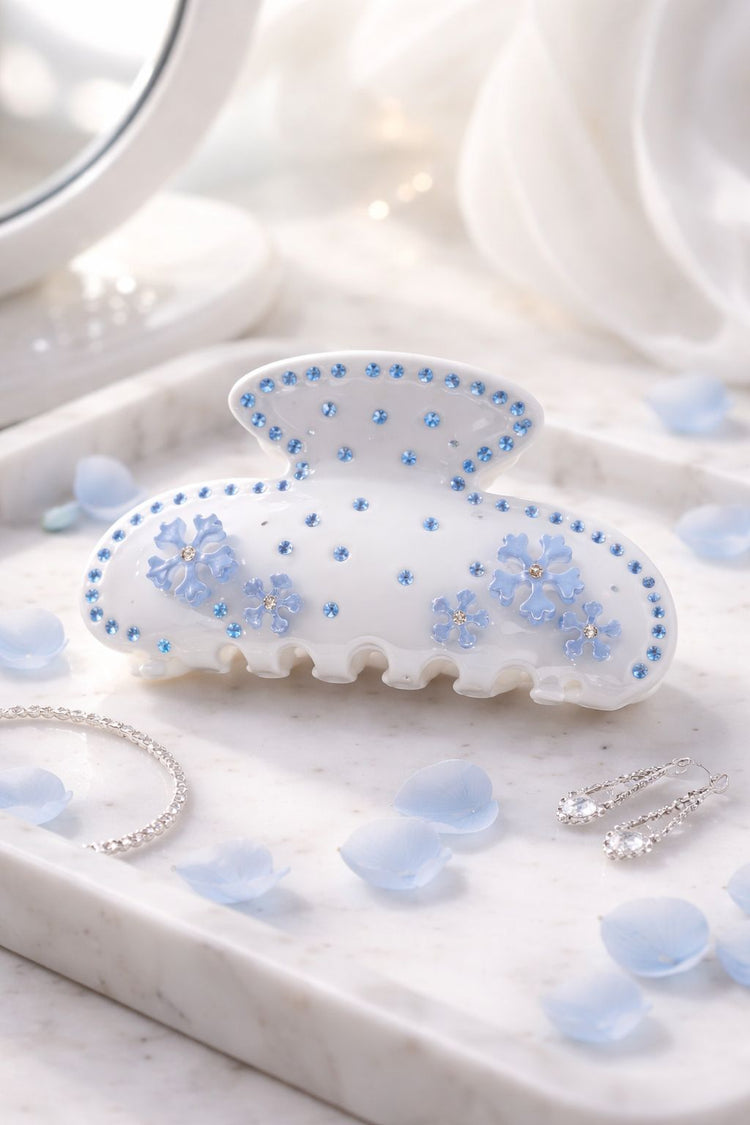 Embrace winter elegance with this frosted white hair claw clip adorned with delicate blue flower appliqués and crystalline rhinestone accents. The translucent finish creates an ethereal, ice-kissed effect, while scattered blue gems evoke sparkling snowflakes. This enchanting accessory brings a touch of wintery magic to your everyday look with a gentle, reliable hold.